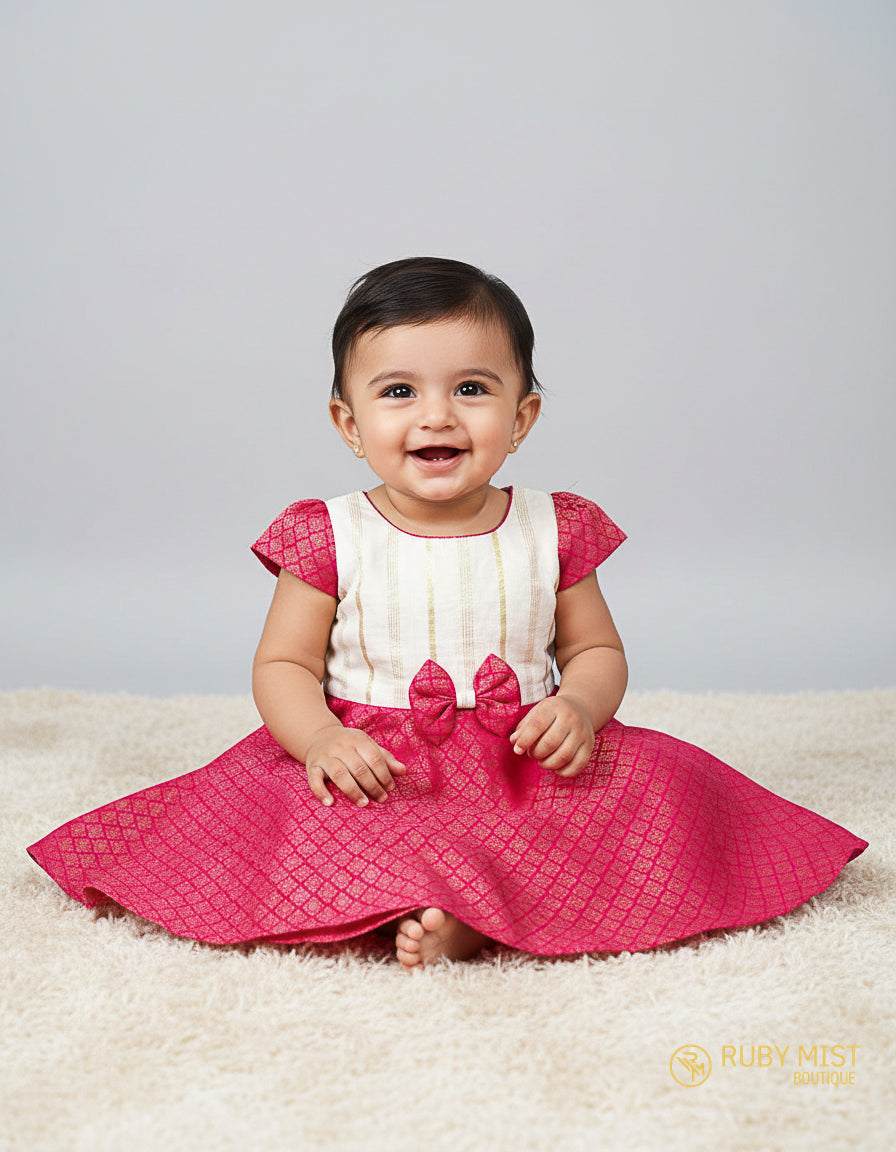 Golden zari stripes patern on yoke portion with round neck and bow. Flared umbrella frock.