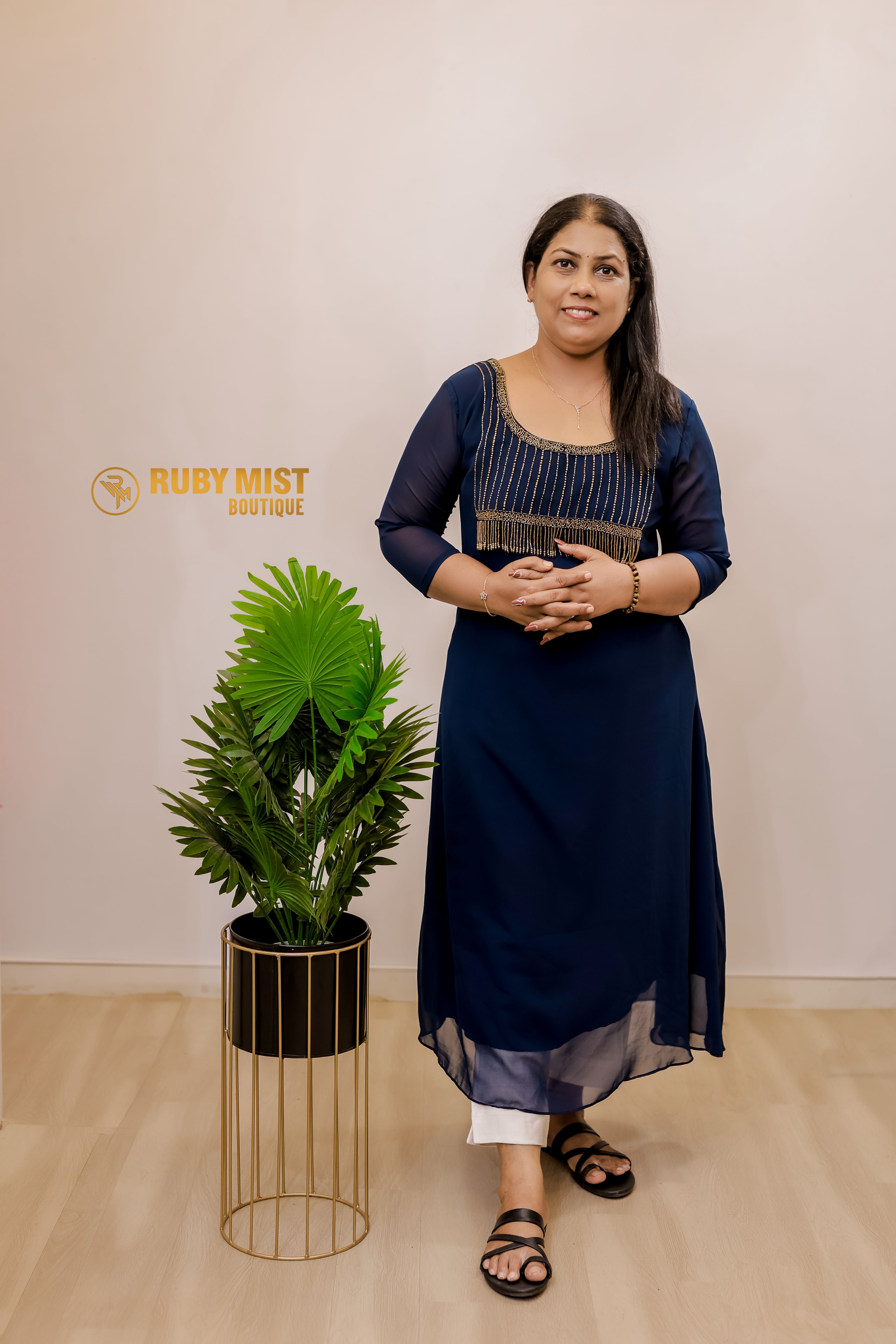 Product form Georgette A- Line Flared Top Rs. 750.00 Cut bead handworked yoke portion and A- line flared top. Read more Read more Color Black Size M L XL XXL Need help with your size? Size finder Out of stock. Dispatch within 30-35 daysShow extra info for delivery time Out of stock This item is a recurring or deferred purchase. By continuing, I agree to the cancellation policy and authorize you to charge my payment method at the prices, frequency and dates listed on this page until my order is fulfilled or I cancel, if permitted. Terms & Conditions Care guide Maintenance instructions• Machine wash 40°• Iron medium temperature• Drying medium temperature• Do not dry clean• Only non-chlorine bleach if needed Reviews 0 reviews Share with your friends Share WhatsApp Deel X Pin it Messenger Email Description Cut bead handworked yoke portion and A- line flared top.