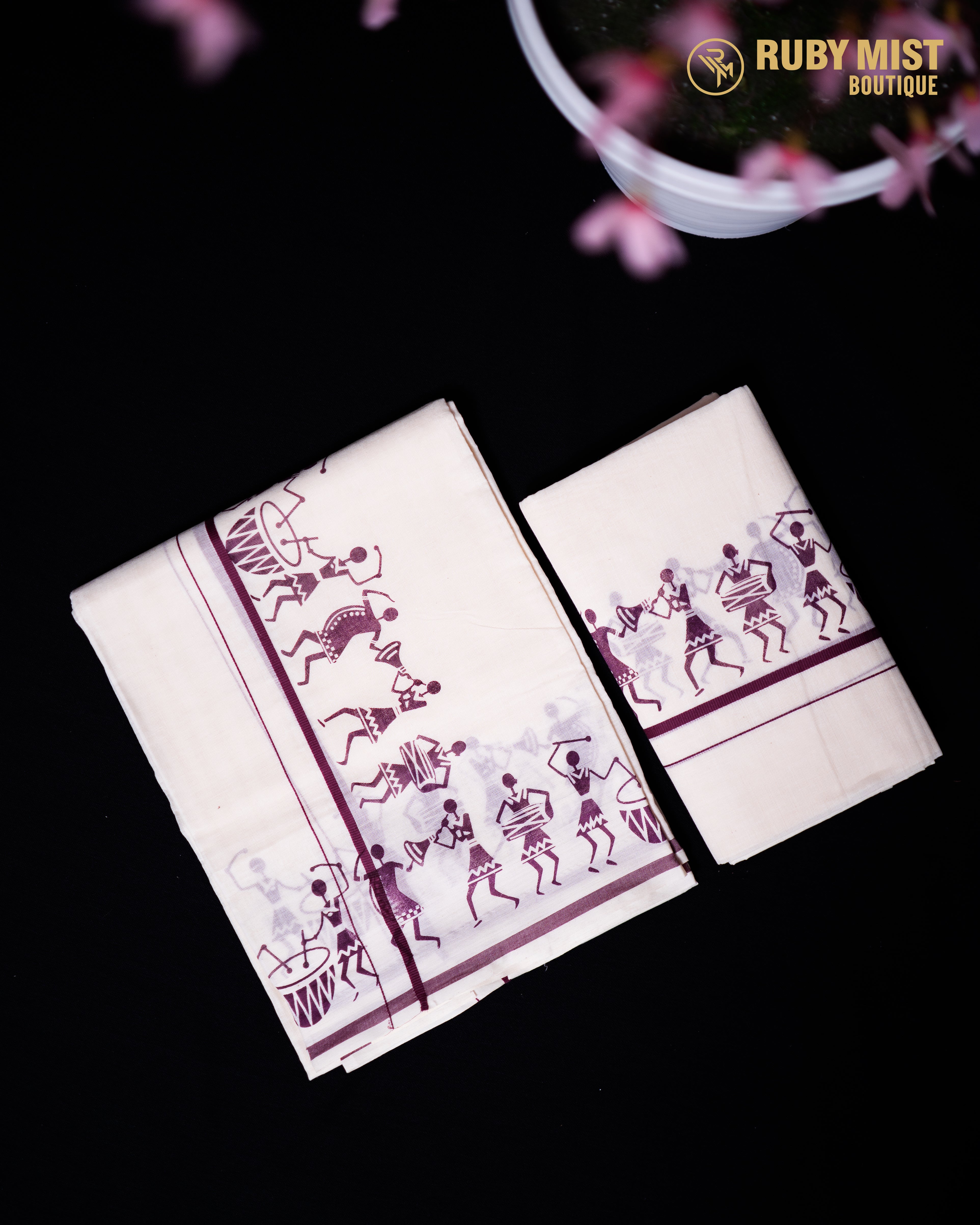 puliyilakkara thin border with Warli print .length 2.80. without blouse .