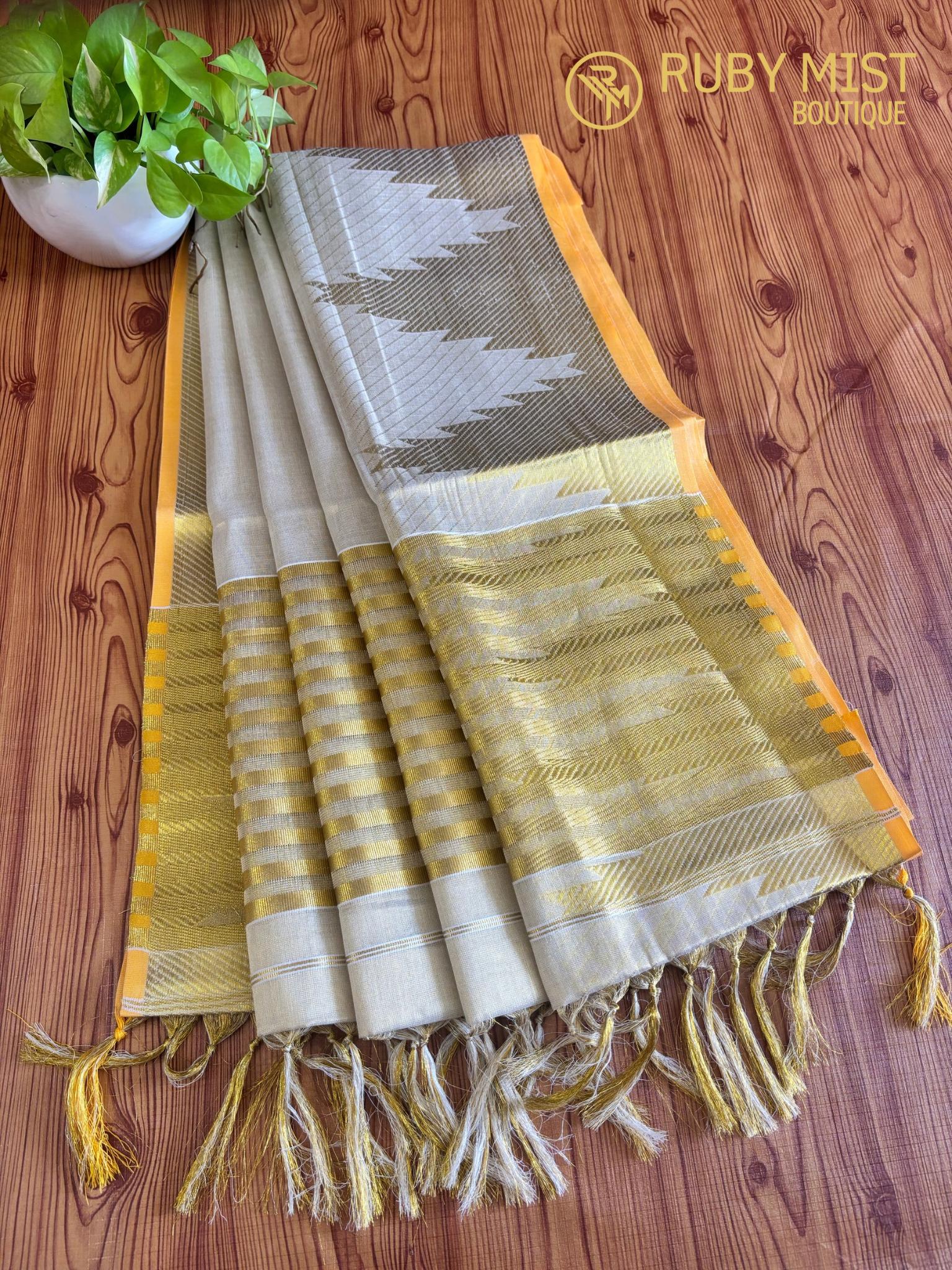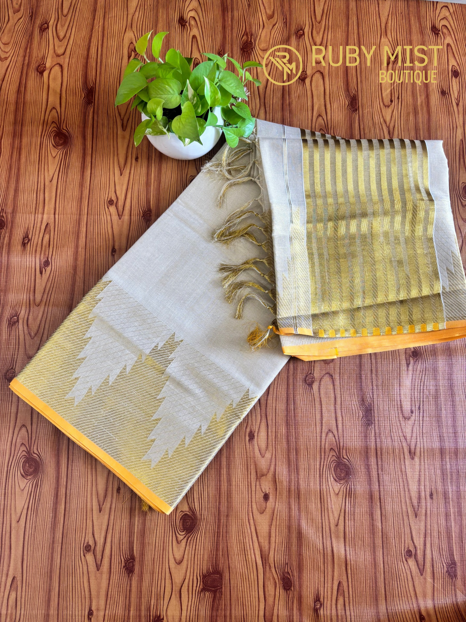 Product form Temple Designed Kerala Saree. Rs. 1,700.00 Golden zari vertical stripes with tazzels and temple design border. Read more Read more Color offwhite Need help with your size? Size finder 7 products in stock. Dispatch in 3-5 daysShow extra info for delivery time Add to cart This item is a recurring or deferred purchase. By continuing, I agree to the cancellation policy and authorize you to charge my payment method at the prices, frequency and dates listed on this page until my order is fulfilled or I cancel, if permitted. Terms & Conditions Care guide Maintenance instructions• Machine wash 40°• Iron medium temperature• Drying medium temperature• Do not dry clean• Only non-chlorine bleach if needed Reviews 0 reviews Share with your friends Share WhatsApp Deel X Pin it Messenger Email Description Golden zari vertical stripes with tazzels and temple design border.